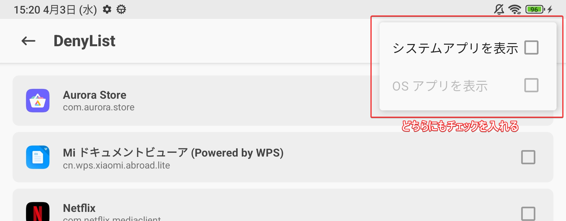右上の3点リーダをタップしてシステムアプリ、OSアプリを表示するように。