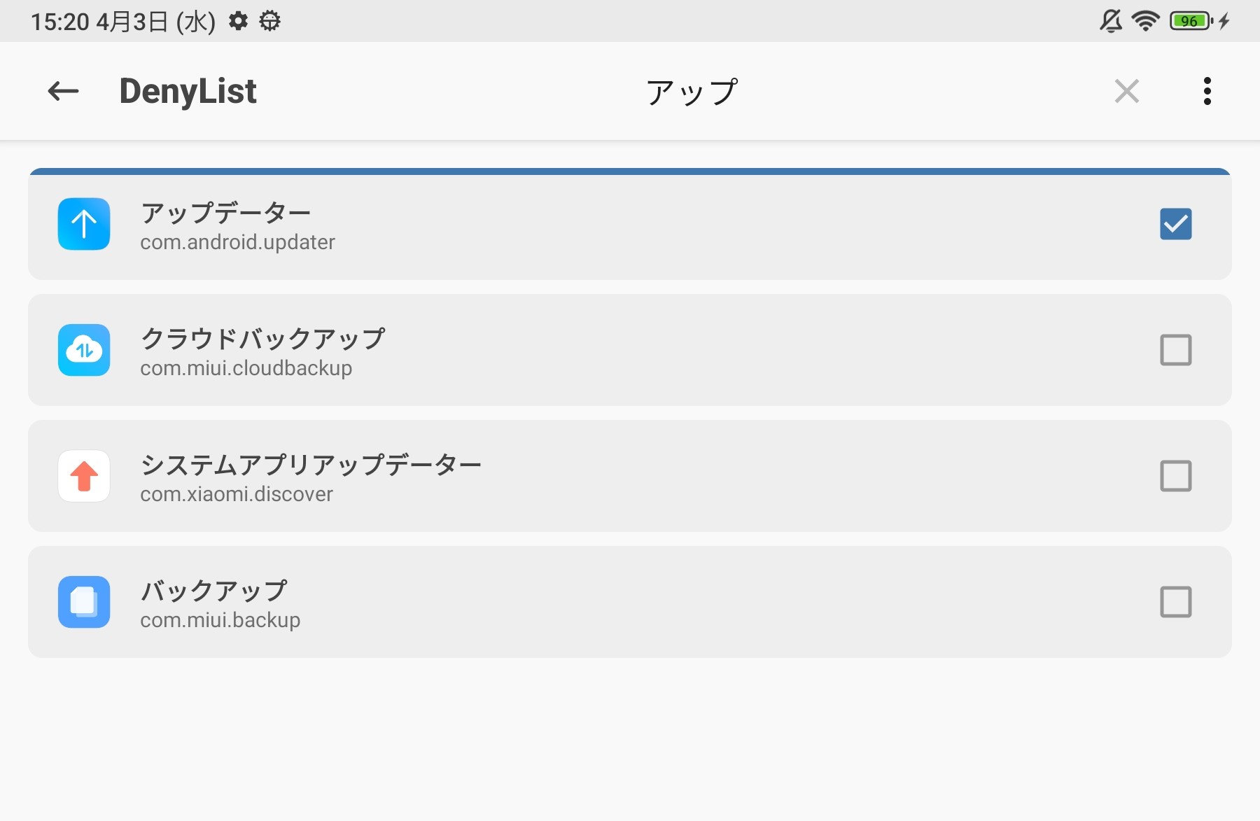 「アップ」と入れて出てきたアップデーターにチェックを入れます。
